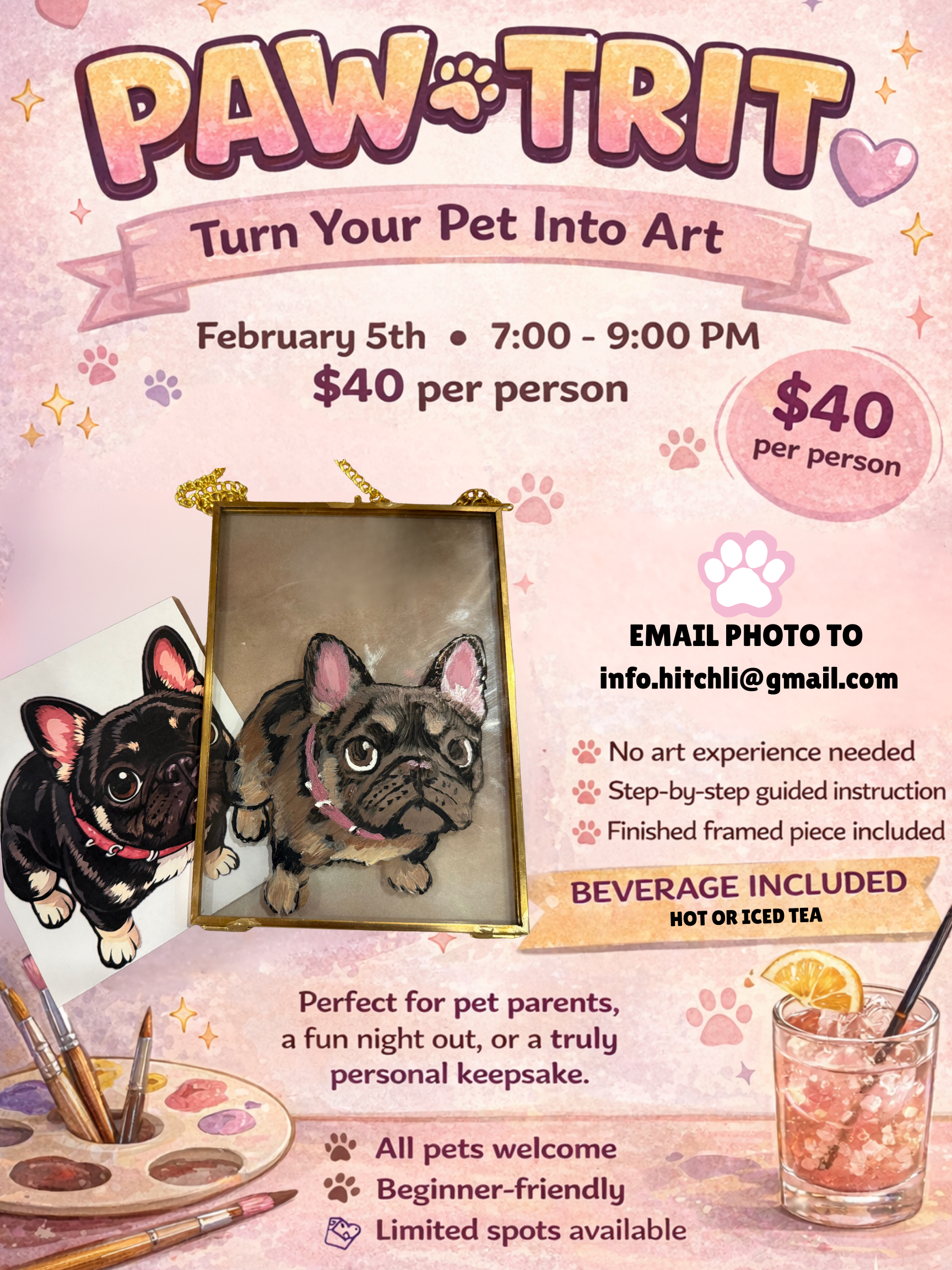 In this guided DIY class, you’ll transform your favorite pet photo into a playful, stylized cartoon portrait, painted by you and finished in a chic hanging frame ready for display. No art experience needed—we’ll walk you through every step.